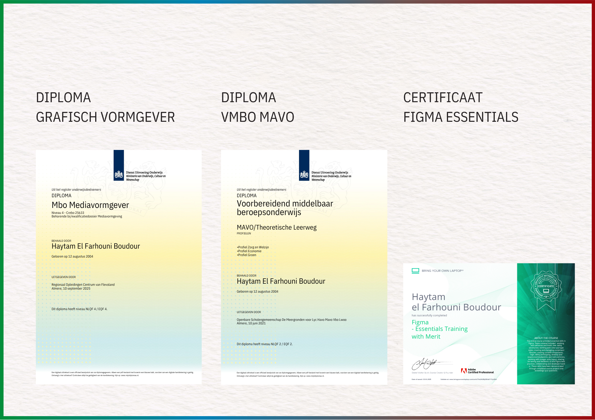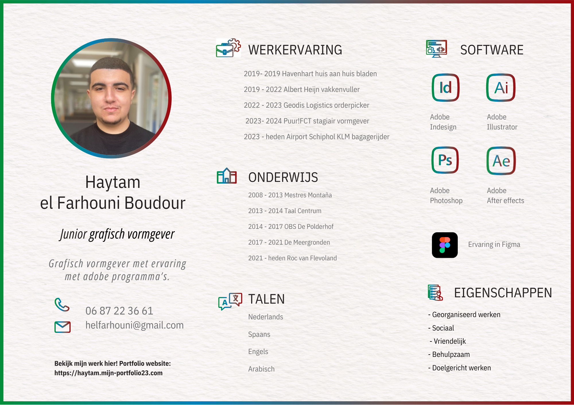 Hi! Mijn naam is Haytam, ik ben 20 jaar oud en afgestudeerd Mediavormgever op mbo niveau 4. Tijdens mijn opleiding heb ik brede ervaring opgedaan met grafisch ontwerp, digitale media, branding en het uitwerken van creatieve concepten. Ik werk graag aan visuele oplossingen die niet alleen mooi zijn, maar ook goed doordacht. Van posters tot animaties, van logo’s tot huisstijlen. Ik haal energie uit elk creatief project.