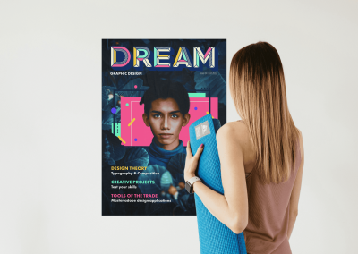 Voor mijn project heb ik een “Dream”-poster ontworpen die inspiratie en verbeelding uitstraalt. Met zachte kleuren, vloeiende vormen en een dromerige compositie wil ik een gevoel van rust en creativiteit oproepen. De poster nodigt de kijker uit om even weg te dromen en zich te laten meevoeren door het ontwerp. Gebruikte software: Adobe indesign en Adobe photoshop